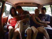 Deux hommes et deux femmes en train d’avoir des relations sexuelles dans un bus
